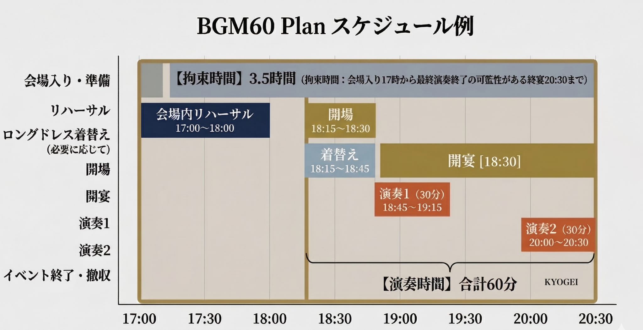 ※拘束時間、セッティング音出し時間60分確保、ロングドレスの場合の着替え時間の確保が可能なスケジュールであれば、上記スケジュール例にかかわらず様々な生演奏演出が可能です。