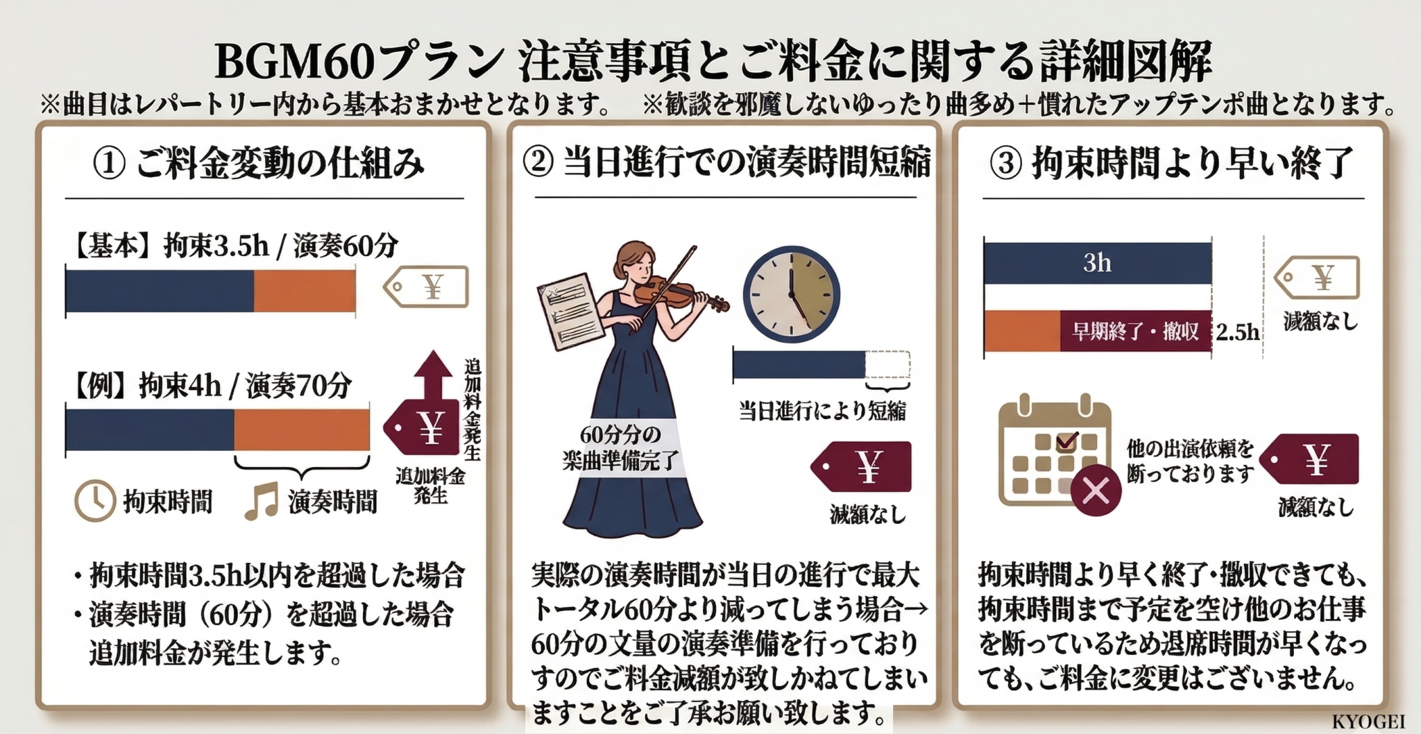 拘束時間3時間30分(会場入・マイクチェックや着替えを含む~最終演奏終了まで:後片付け時間は含みません) ※「会場内リハーサルがどれぐらいかかるか」という詳細は、下記リンク内の内容をご確認ください。 ②本番会場内でしかリハーサルができない編成の場合 (ピアノやドラム等、控室に簡単に持ち運べない楽器を含む編成) お見送りの演奏は終わりが読めないため、延長料金が発生しやすく、基本的に含まれておりません。拘束時間内に終わるスケジュールでしたらお見送り演奏も可能です。 |